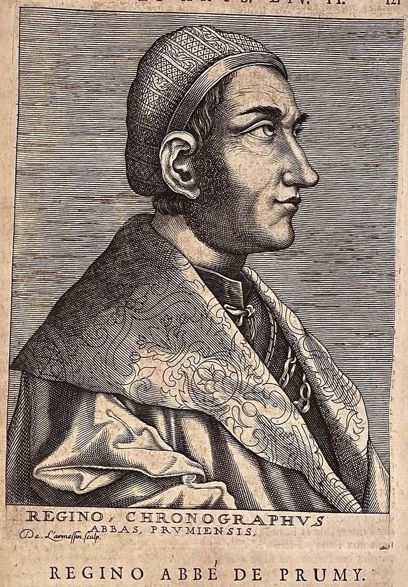 A late seventeenth century engraver imagines Regino of Prum. Photo Credit: By Nicolas de Larmessin III, Esme de Boulonais - Isaac Bullart. Académie Des Sciences Et Des Arts. Amsterdam: Elzevier, 1682., Public Domain, https://commons.wikimedia.org/w/index.php?curid=83827429